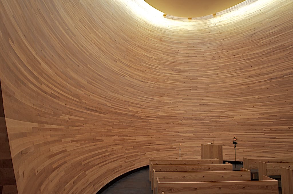 Designed by the Finnish K2S Architects and opened in 2012, the chapel boasts a unique social interface. The architecture is equally innovative. Parametric software was used to define the curved shape and the high level of precision in the wooden cladding was achieved by CNC-technology. As a whole, the chapel demonstrates a new wave of Finnish expertise in digital design, fabrication and wooden tectonics.