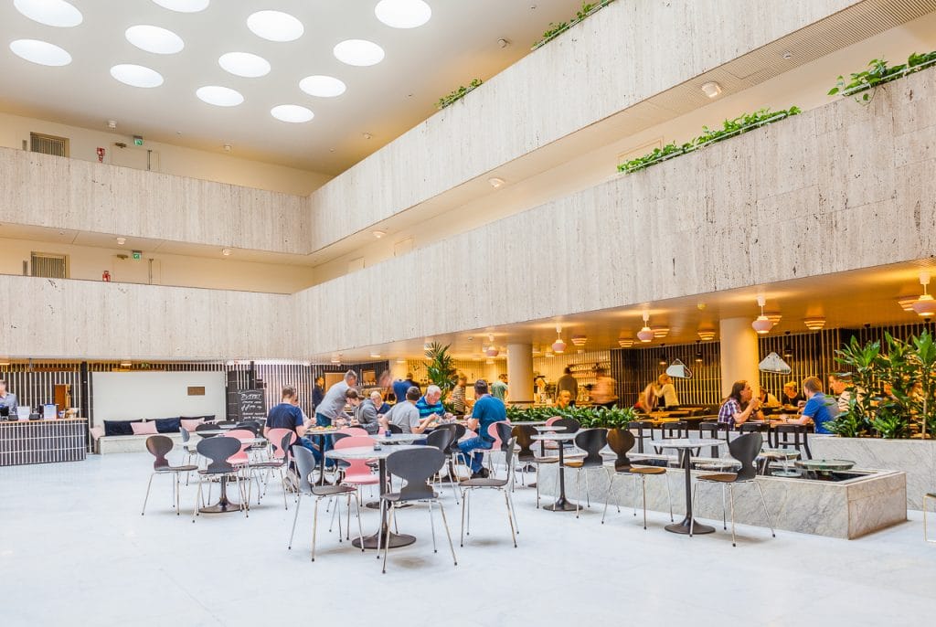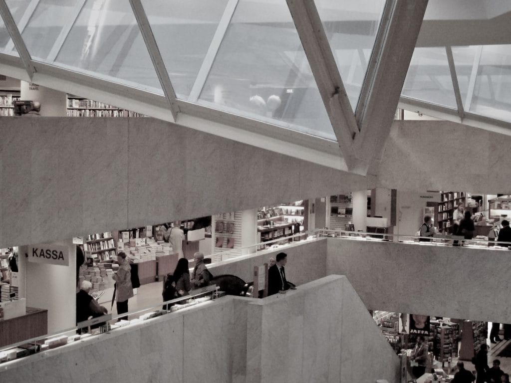 This marble-clad store on three floors was completed in 1969. Sculptural skylights create a serene atmosphere for browsing the largest selection of books in Scandinavia. Café Aalto on the second floor is a classic meeting place.