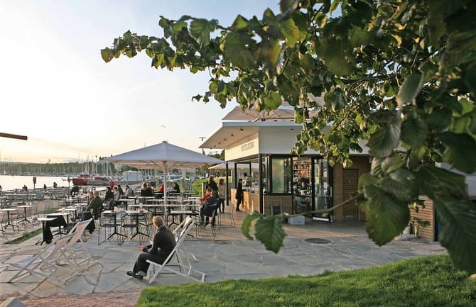 In the Hernesaari district, this café-bar has become one of the most popular spots for drinks and casual meals in southern Helsinki during summer. Designed by Talli Architects like a contemporary seaside cabin with an open plan and a large terrace.