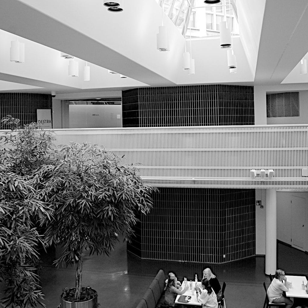 Office building by the Kamppi shopping centre with a covered patio courtyard and a branch of Robert’s Café. A calm environment in the heart of the city.