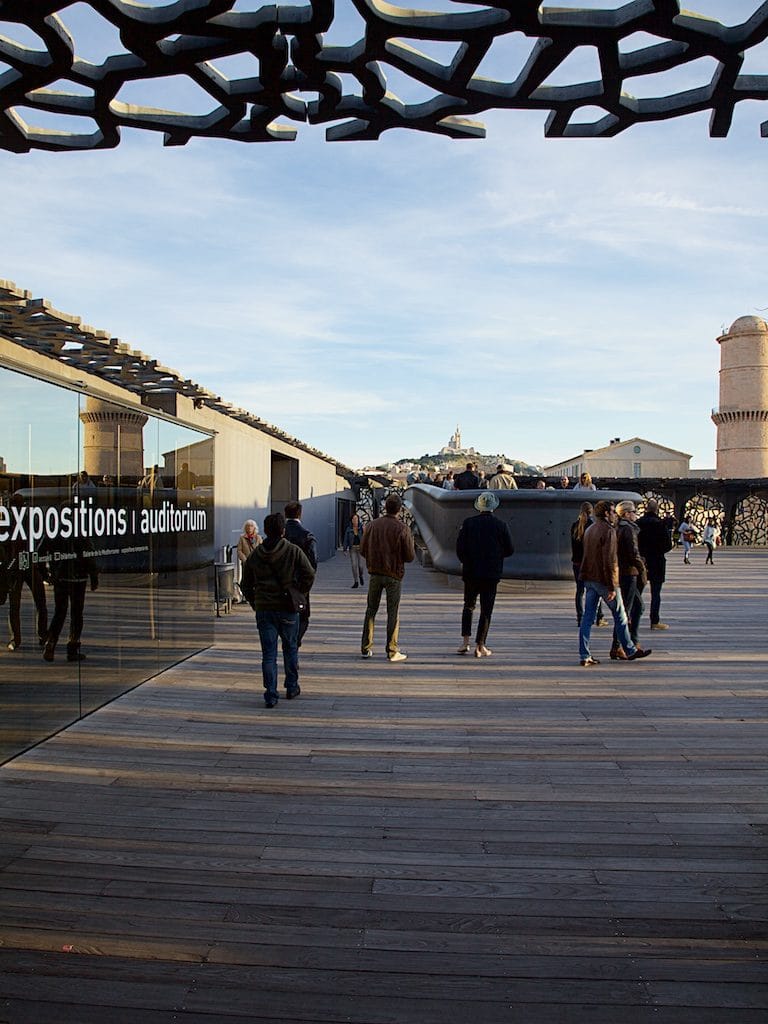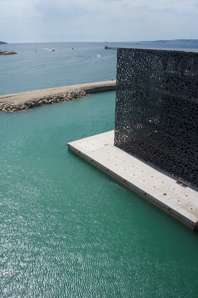 Designed by Provence-based architect Rudy Ricciotti , the museum also provides a link between the quayside and the historic Saint Jean fortress. A ramp circulates behind the open ornamental façade, leading to the roof terrace where a narrow footbridge extends to the landscaped fortress – now open to the public for the first time as a beautifully redesigned ethnographic museum. The building is then linked back to the Panier district by another long footbridge crossing the coastal boulevard. This spectacular location provides varied views over Marseille.
