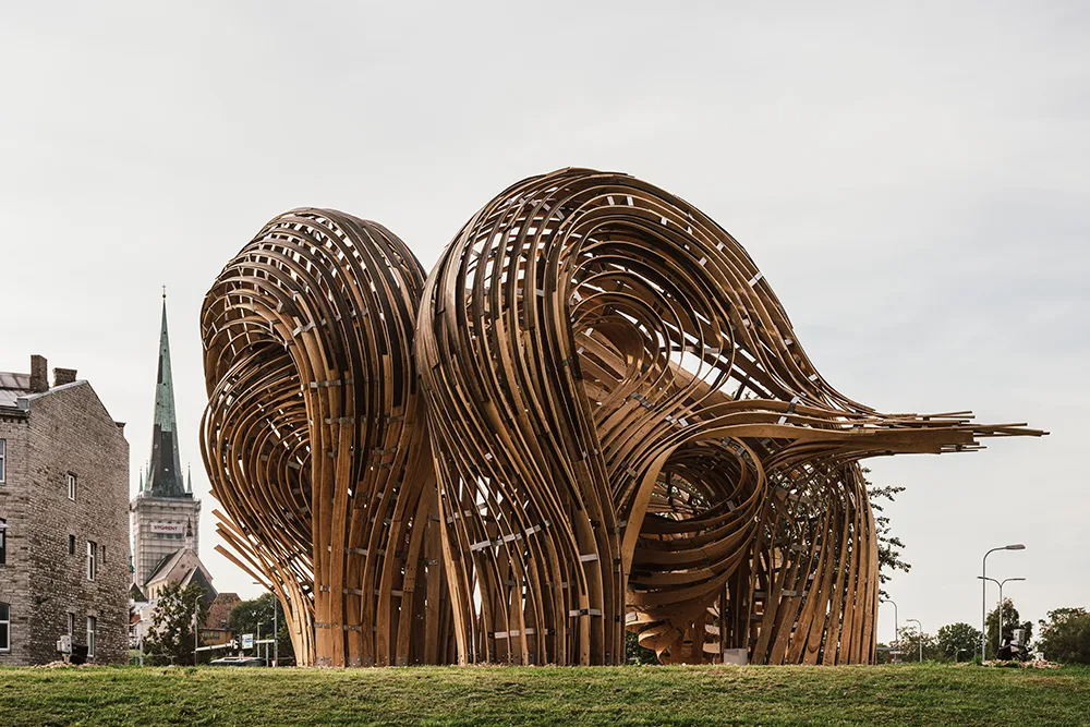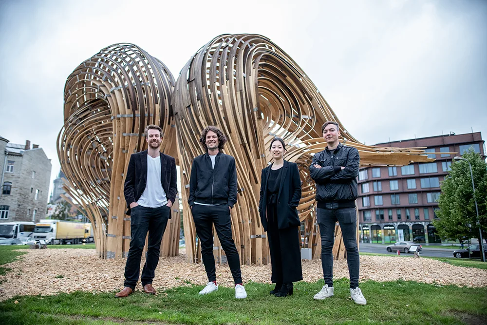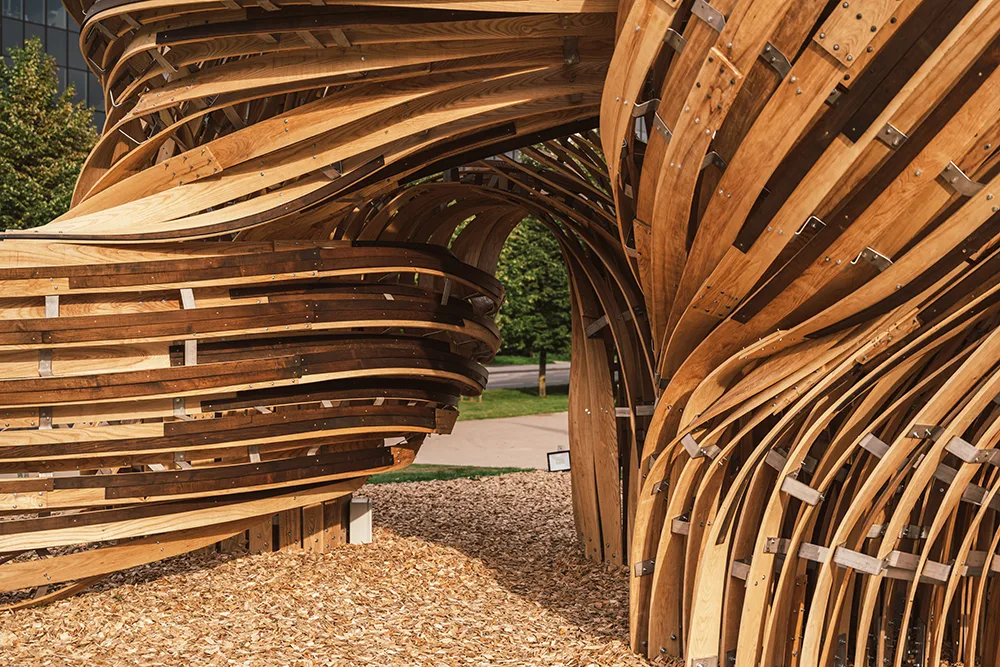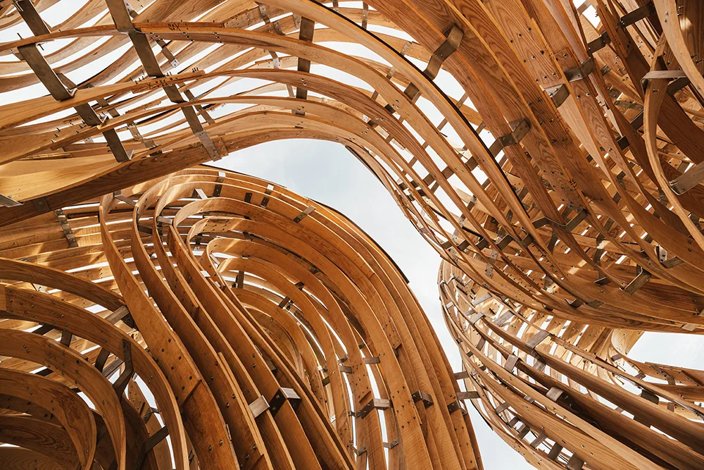 The pavilion is created with steam-bent wooden boards of 100 x 10 mm, bound together into a sculptural form, that can be entered and explored from various view points. It is a kind of futuristic vision of the modernist bent-ply aesthetic, created with a digital system, in which no physical drawings were made. It plays with surface and volume in the form of a sculptural giant timber knot. The winning design is a collaboration with a team of young designers and architects based in London, and Fologram, a design research practice and technology startup. Fologram is a Melbourne-based company, which builds software for artistic and architectural projects. For the experimental installation holographic models were used in the construction process.